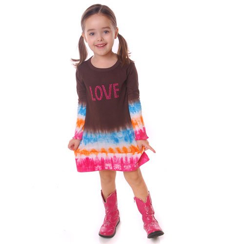 This brown tie dye dress from Sophias Style is a great look for your infant, toddler or little girl. Long-sleeved brown dress features pink, orange and blue tie dye detail on the sleeves and skirt. The word LOVE is spelled out in pink jewels across the chest. A great look for school! More Detail..
