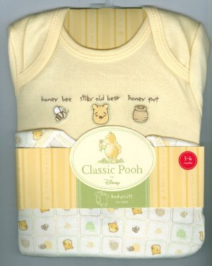 Here is a brand new, unopened package of 2 Classic Pooh bodysuits or onesies. They are sized to fit a baby, 3-6 months, up to 16 pounds, up to 25.5 inches long. Each one has an expandable neck opening which slides gently over baby's head, and reinforced bottom snaps for quick diaper changes. Made of 100% soft cotton, machine wash cold, tumble dry low. From a smoke free home.
